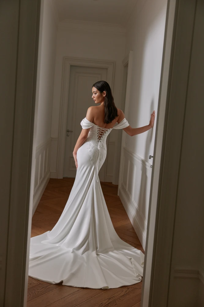 Our Elise gowns features a off the shoulder design with a soft natural pleat over the hip area giving it a romantic feel and at the same time a forgiving fit