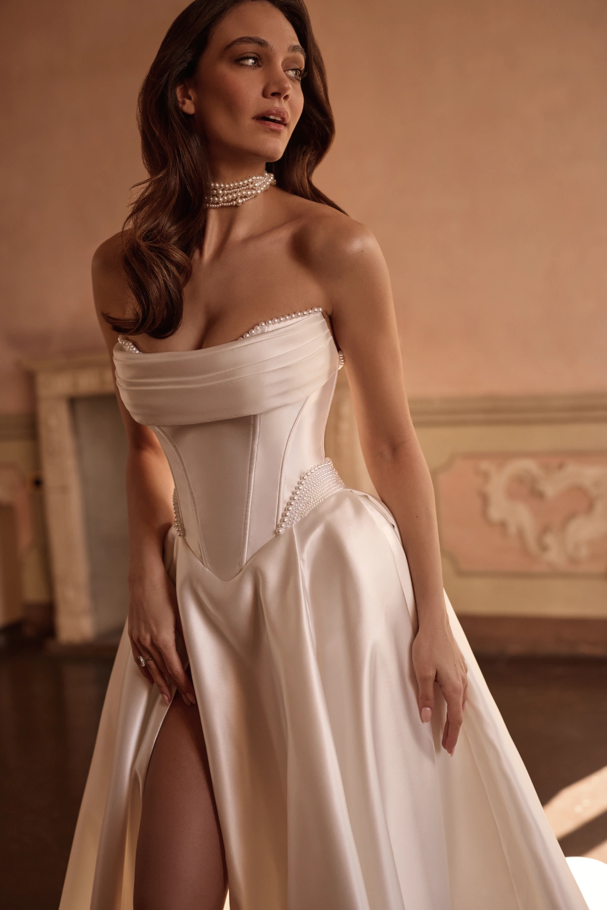 This beautifully constructed aline gown is spectacular. Her pearl details makes this gown very special. She can be ordered with or without a zip