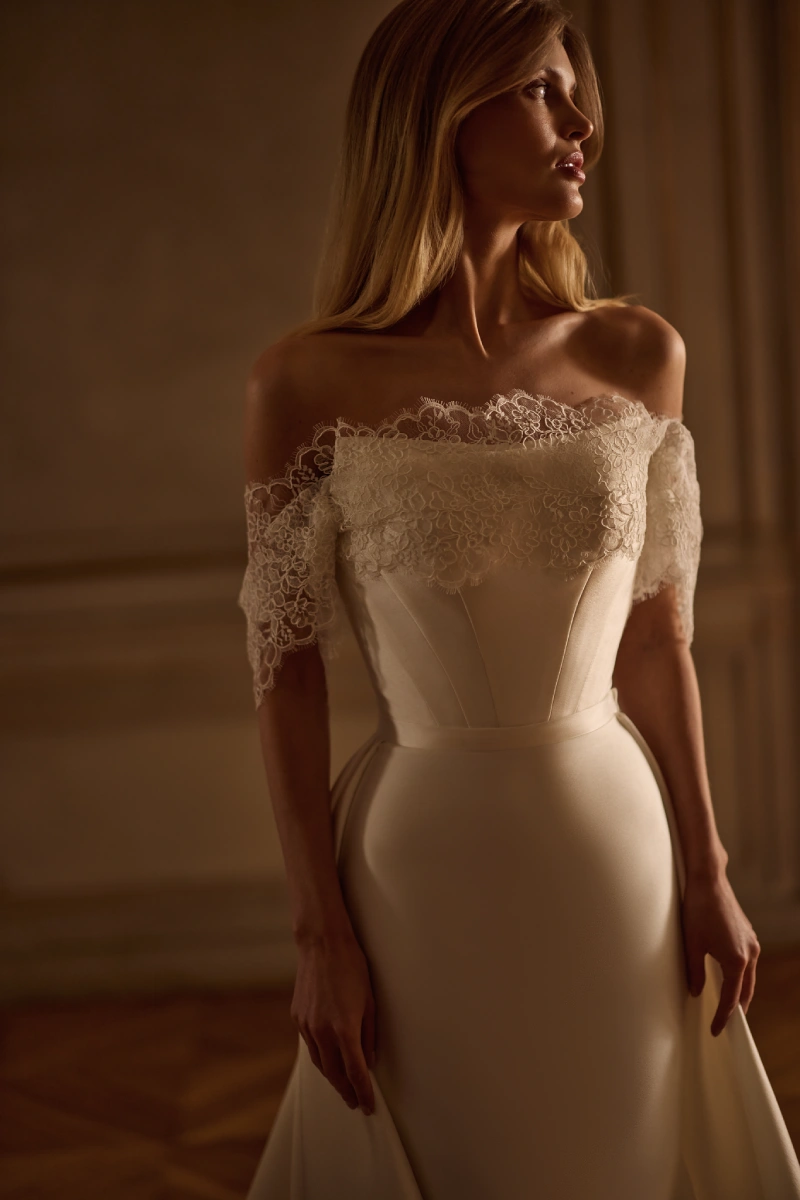 Filipa is such a beautifully detailed fit and flare dress. Her nude colouring really makes the ivory lace pop and stand out beautifully. Her 3D handcrafted flowers are unlike anything you have ever seen, they are so soft and delicate. Her low back is elegantly created while the subtle sparkle in the fabric really catches the eye.
