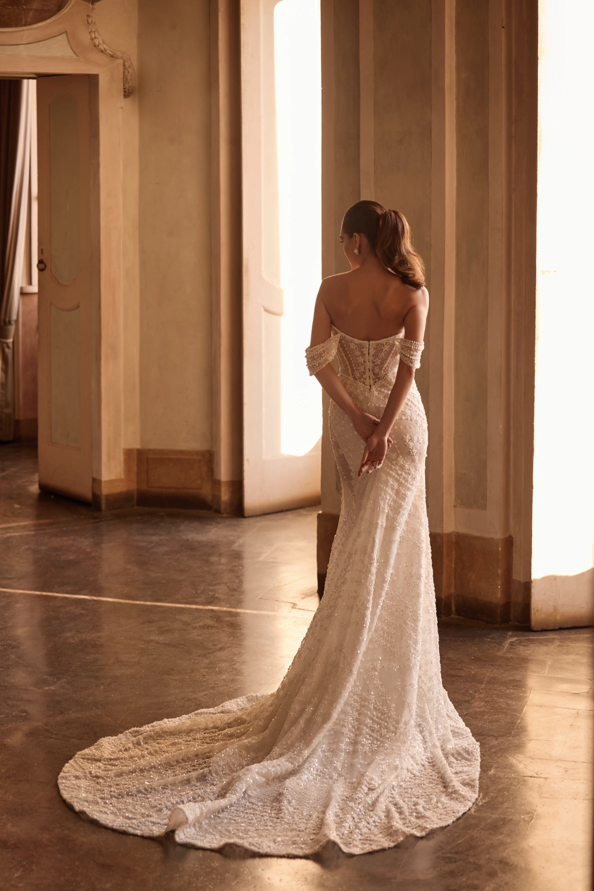Full beard gown with delicate off the shoulder details. The corset is design to give this gown a feminine look yet sexy. Dress can be ordered with our the sheer side if requested