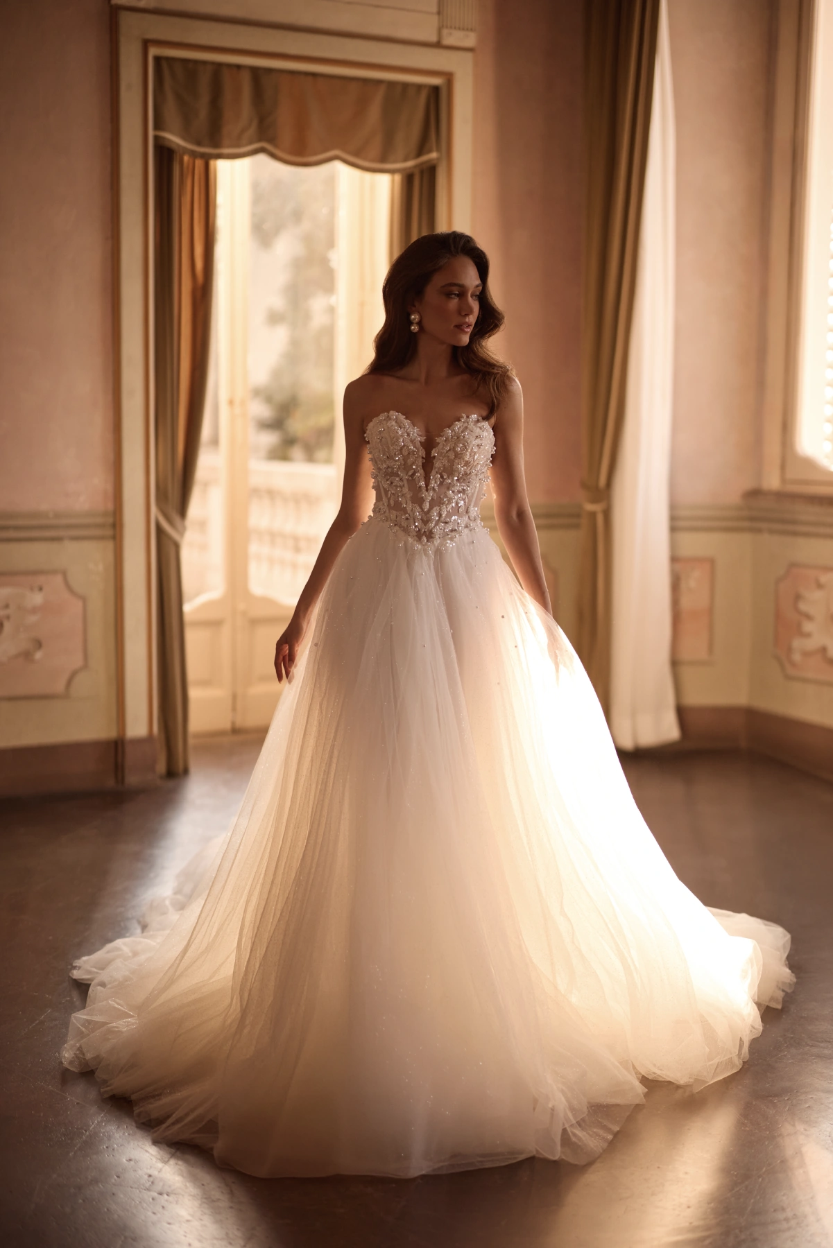 Aline tulle gown featuring a constructed bodice with lace and pearl detail. Her plunging neckline give a modern feel to the gown. Available in Lace up or zip